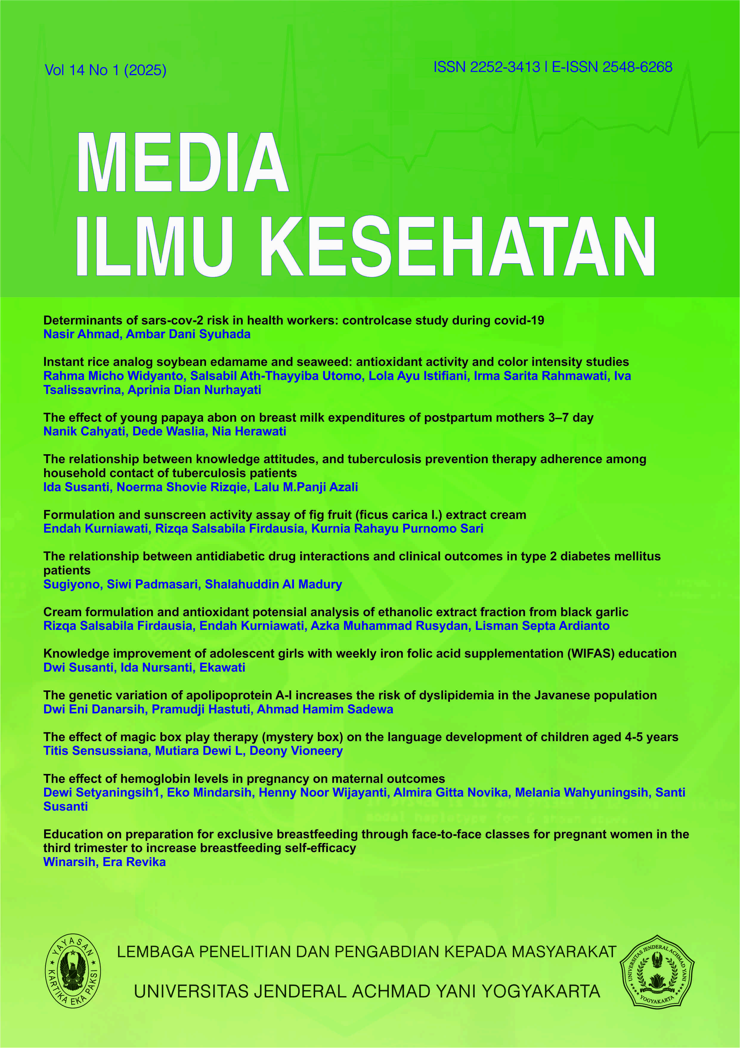 Vol. 14 No. 1 (2025)Media Ilmu Kesehatan is a scientific journal that aims to publish and disseminate various scientific papers to add insight and science in the field of health. That includes the following but is not limited to nursing, public health, pharmacy, blood bank technology, health recorder and information, midwifery, health analysts, nutrition, psychology, and other health sciences. The focus of published articles is a research article, at least the last 3 years of publication. The Editorial receives the manuscript of the publication of the research and will perform the screening based on scientific relevance. The received script is an original article and is expected to be completed with a validation page. The editor will receive and publish the manuscript in the journal to be published after obtaining a recommendation from the reviewer for consideration. Media Ilmu Kesehatan has previously appeared in print in 2012 with ISSN 2252-3413. Since the December 2016 online edition has been published with E-ISSN 2548-6268. Media Ilmu Kesehatan is published 3 times, there are in April, August, and December.