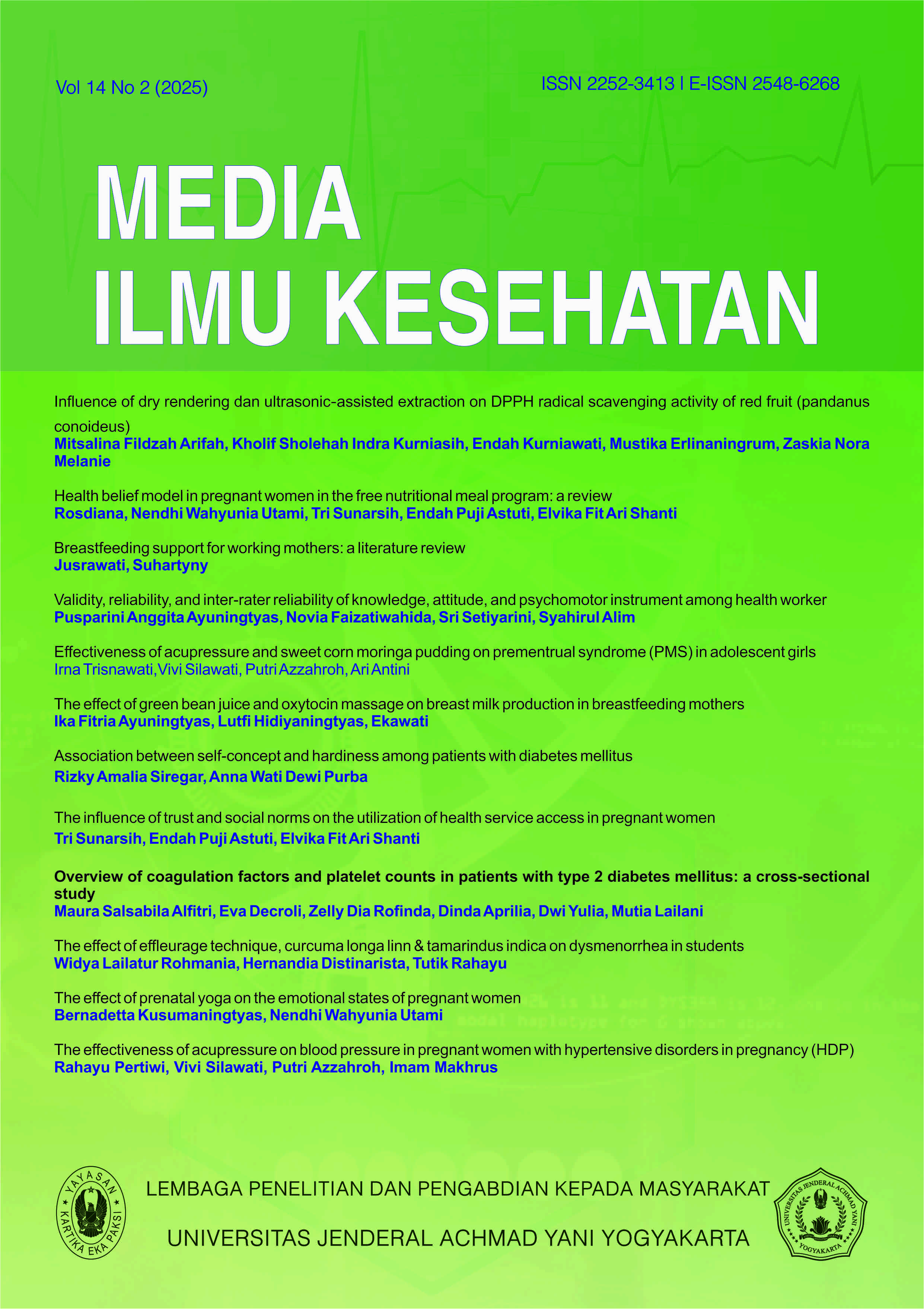 Vol. 14 No. 2 (2025)Media Ilmu Kesehatan is a scientific journal that aims to publish and disseminate various scientific papers to add insight and science in the field of health. That includes the following but is not limited to nursing, public health, pharmacy, blood bank technology, health recorder and information, midwifery, health analysts, nutrition, psychology, and other health sciences. The focus of published articles is a research article, at least the last 3 years of publication. The Editorial receives the manuscript of the publication of the research and will perform the screening based on scientific relevance. The received script is an original article and is expected to be completed with a validation page. The editor will receive and publish the manuscript in the journal to be published after obtaining a recommendation from the reviewer for consideration. Media Ilmu Kesehatan has previously appeared in print in 2012 with ISSN 2252-3413. Since the December 2016 online edition has been published with E-ISSN 2548-6268. Media Ilmu Kesehatan is published 3 times, there are in April, August, and December.